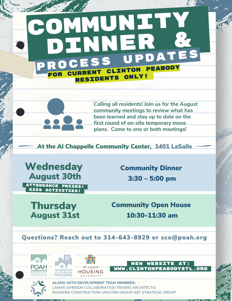 Calling all residents! Join us for our regular monthly update on Wednesday, August 30th from 3:30pm – 5:00pm for the Community Dinner and project updates.